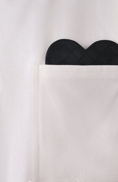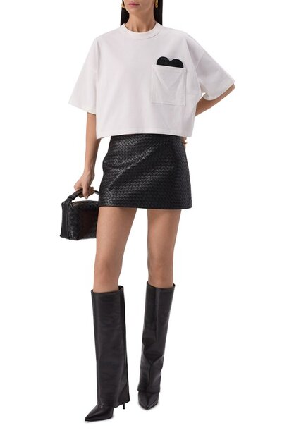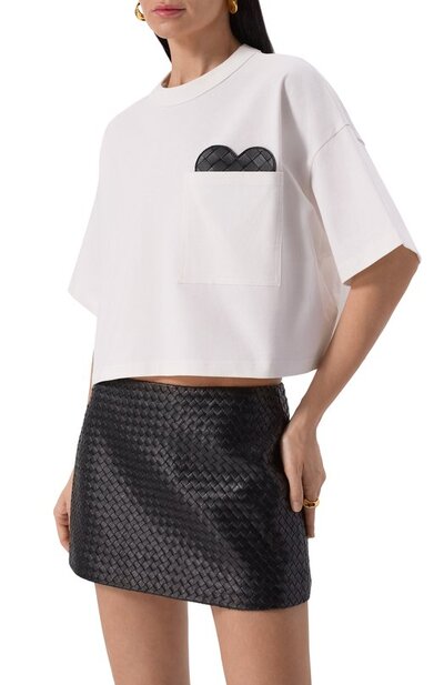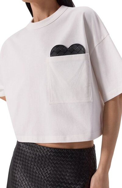 Для пошива укороченной футболки со спущенной линией плеч использовали хлопковое джерси. Модель дополнили нагрудным карманом с контрастным кожаным патчем-сердцем, сплетенным вручную в технике intrecciato.
