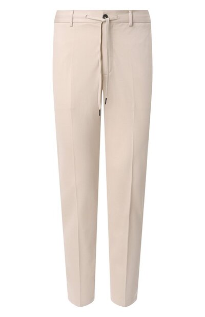 Брюки со стрелками сшили из эластичного хлопкового пике. Модель с поясом-кулиской дополнили парой карманов в боковых швах и двумя сзади. Предлагаем сочетать чиносы с джемпером и лоферами.