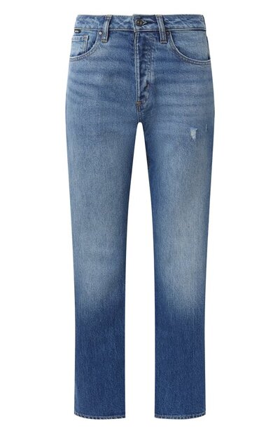 Джинсы из эластичного хлопкового денима выбелили и декорировали потертостями, придав им состаренный вид. Укороченную модель с пятью карманами дополнили брендированным ярлыком сбоку и патчем с рельефным логотипом на поясе сзади.