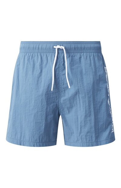 Плавки-шорты с широким эластичным поясом-кулиской и двумя боковыми карманами сшили из жатого нейлона. Слева модель украсили контрастной вышивкой в виде логотипа бренда.