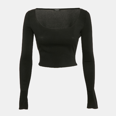 This cropped black jersey top from Versace is a classy choice. With a streamlined fit and long sleeves, it’s a sleek foundation piece that pairs effortlessly with high waisted silhouettes.