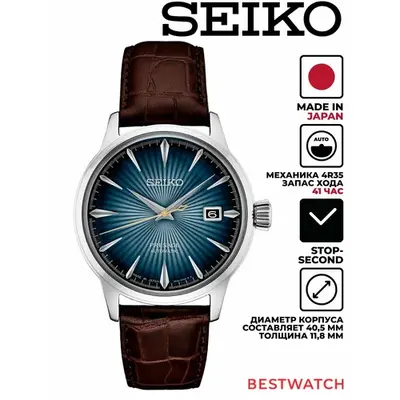 Мужские механические часы с автоподзаводом (с возможностью ручного подзавода). Калибр механизма 4R35 на 23 камнях. Частота 21 600 полуколебаний в час. Запас хода 41 час. Функция стоп-секунды. Центральные часовая, минутная и секундная стрелки. Апертура даты в позиции 3 часов. Градиентный синий циферблат. Круглый корпус выполнен из нержавеющей стали. Диаметр корпуса составляет 40,5 мм, толщина 11,8 мм. Коричневый кожаный ремешок шириной 20 мм, стандартная застежка. Выпуклое минеральное стекло Hardlex устойчивое к мелким механическим повреждениям. Прозрачная задняя крышка. Водостойкость WR 50 (мытье рук, дождь).