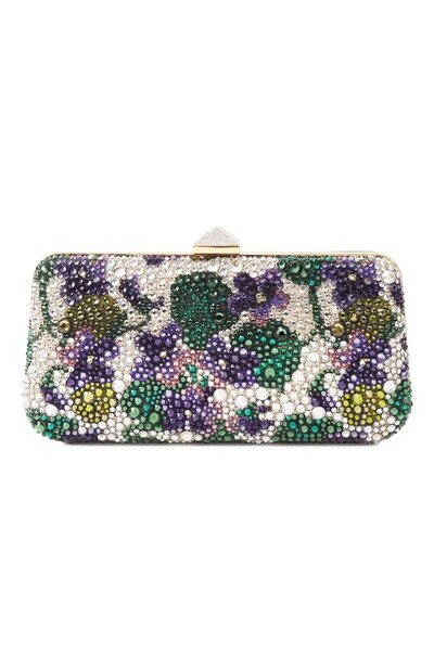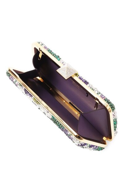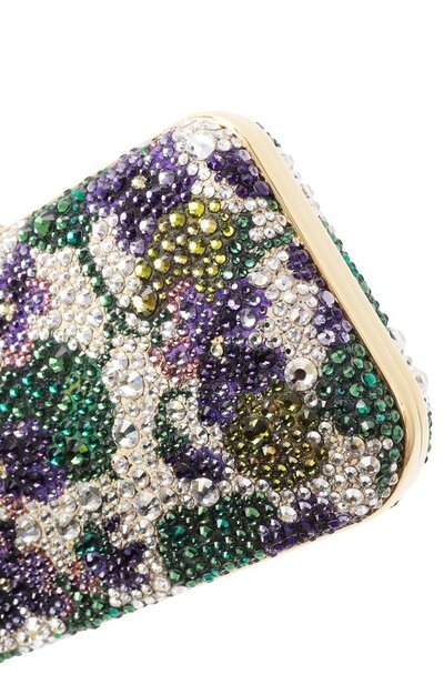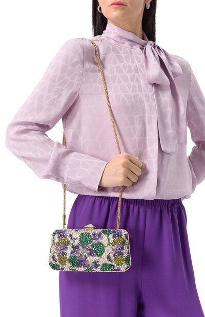 Кожаный клатч Carry Secrets украсили цветными кристаллами, придающими объем цветочному мотиву. Минодьер с рамочным замком, закрывающимся защелкой в форме знакового шипа-пирамиды, дополнили съемным плечевым ремнем-цепочкой.
