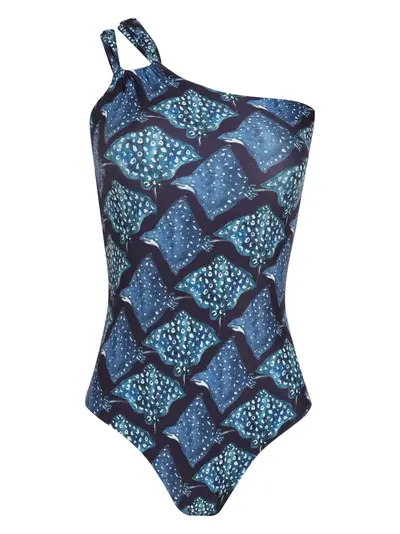blue asymmetric neck sleeveless all-over graphic print Be mindful to try on swimwear over your own garments.