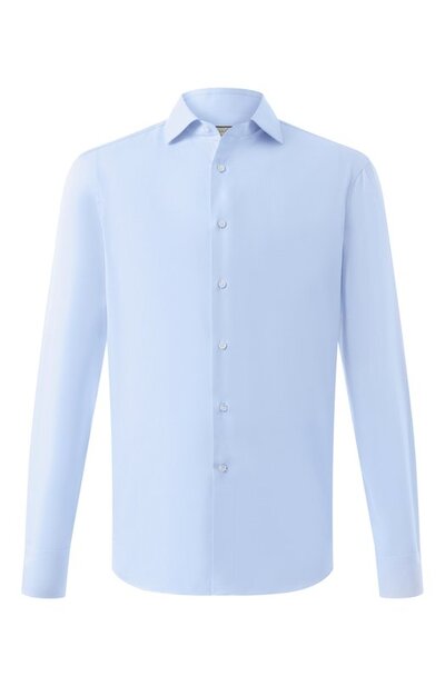 Сорочку кроя Regular fit сшили из гладкого хлопкового поплина. Модель с закругленными манжетами и воротником «акула» застегивается перламутровыми пуговицами.