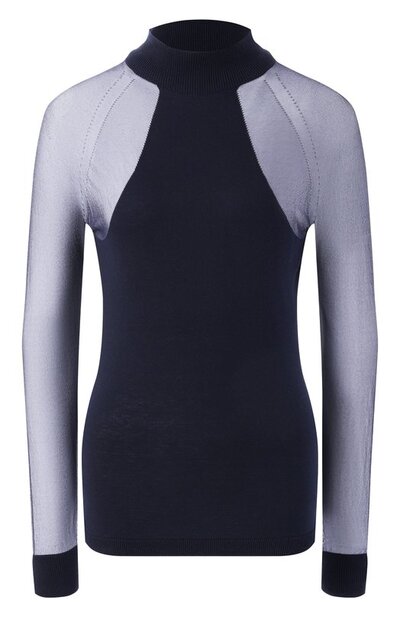 Для изготовления водолазки с горловиной, манжетами и поясом в рубчик использовали трикотаж на основе шелка и вискозы. Рукава реглан выполнили из полупрозрачного материала.