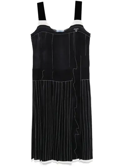 circa 2000s black silk stripe print scoop neck sleeveless velvet trim concealed side hook and zip fastening pleated skirt unlined Condition: GOOD. This previously owned and used item is in good condition with minimal signs of use. This may include fading of material or plating and scratches.