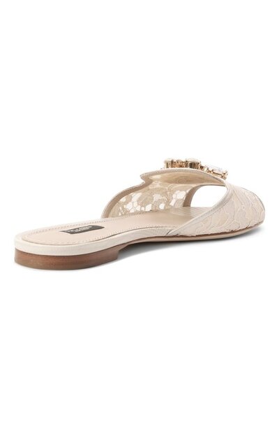 Верх шлепанцев Rainbow с широкой фигурной перемычкой из кружева Taormina украсили аппликацией с кристаллами, напоминающей брошь. Подошву на невысоком наборном каблуке обтянули гладкой кожей.