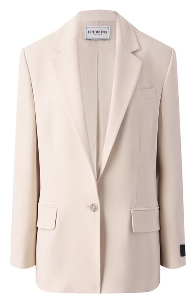 Однобортный жакет с прямоугольными лацканами и высокой шлицей сшили из костюмной ткани на основе ацетата и вискозы. Левый рукав модели с тремя прорезными карманами украсили контрастной нашивкой с логотипом.