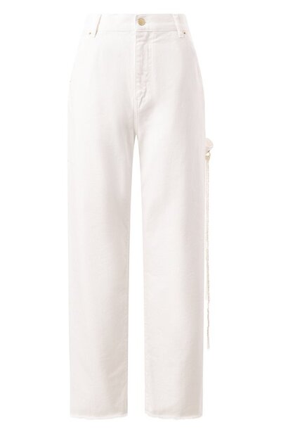 Для пошива широких джинсов Lisa с бахромой по краям и шестью карманами использовали хлопковый деним. Брючины сзади снизу украсили разрезами, а слева модель дополнили петлей со съемным шнуром из перламутровых бусин разного размера. На поясе закрепили фирменный патч.