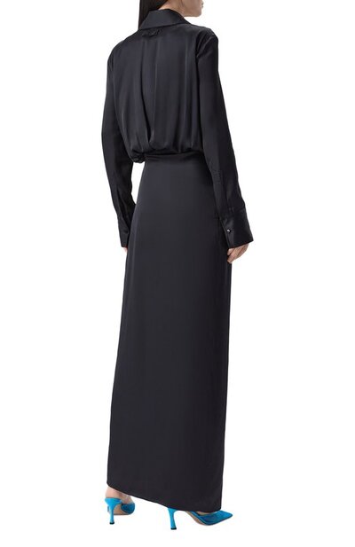 Платье с широкими прямоугольными манжетами сшили из вискозного атласа. Модель с глубоким декольте и запахом, формирующим драпировку и высокий разрез сбоку, украсили фирменной нашивкой сзади.