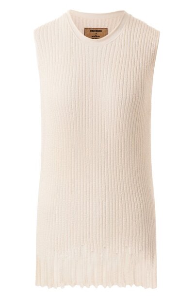 Топ с круглым вырезом и спущенными внизу петлями связан из хлопковой пряжи с добавлением шелка. Эластичная модель в рубчик украшена сзади фирменным простроченным прямоугольником.