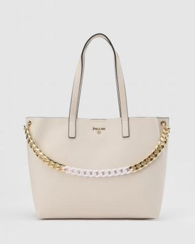 Сумка Pollini из искусственной кожи. Сумка в бежевом цвете станет прекрасным дополнением летнего образа. Декором служит цепочка из металла в золотистом и белом цвете. У сумки удобные кожаные ручки, позволяющие носить её на плече. Единственное отделение закрывается на магнитный замок.