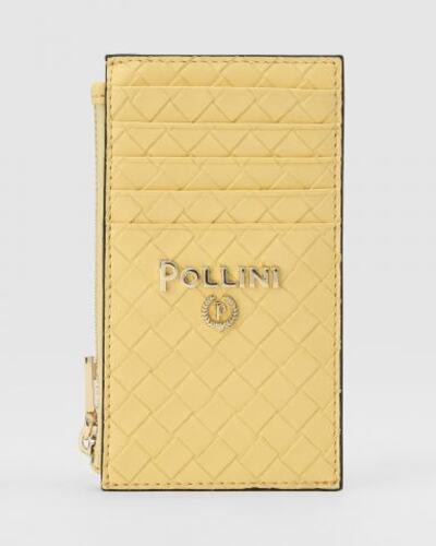 Визитница Pollini из кожи желтого цвета. Компактная визитница, в которой можно носить ваши любимые карты. Аксессуар выполнен из искусственной кожи с эффектом переплетения и украшен фирменным логотипом из золотистого металла спереди. Спереди расположены 5 слотов для карт, на боковой стороне предусмотрен карман на молнии.