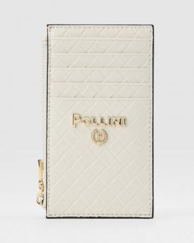 Визитница Pollini из кожи белого цвета. Компактная визитница, в которой можно носить ваши любимые карты. Аксессуар выполнен из искусственной кожи с эффектом переплетения и украшен фирменным логотипом из золотистого металла спереди. Спереди расположены 5 слотов для карт, на боковой стороне предусмотрен карман на молнии.
