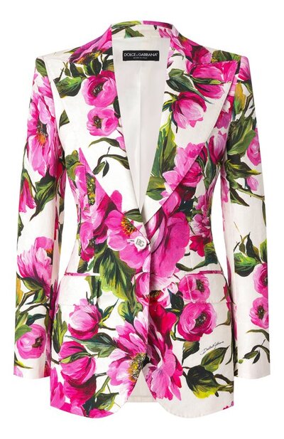 Приталенный жакет с широкими лацканами и двумя шлицами сзади дополнили тремя карманами. Модель из эластичного хлопкового жаккарда с брендированным цветочным принтом застегивается пуговицей с рельефной монограммой DG.