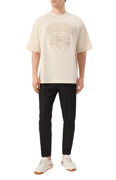 Принт в виде фирменной символики на футболке совместили с вышивкой. Модель со спущенной линией плеч и горловиной в рубчик выполнили из хлопкового джерси.