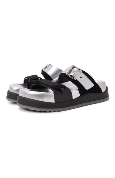 Сандалии на широкой протекторной подошве с формованной стелькой выполнили из матовой и металлизированной кожи. Модель застегивается ремешком с пряжкой на подъеме и текстильной лентой велкро на союзке.