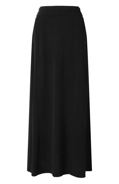 Расклешенную макси-юбку выполнили из шелкового трикотажа с добавлением вискозы. Модель с широким эластичным поясом дополнили двумя боковыми карманами с заклепками на листочках.