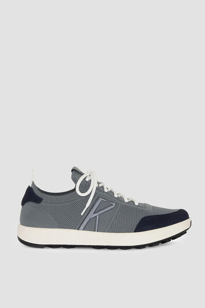 Сникеры из спортивного хлопкового текстиля от бренда Kiton. Модель серого цвета с широкой колодкой и разными текстурами оснащена вставками из бархатистой тёмно-синей замши на носке и в задней части. Принадлежность удобной пары Дому обозначена вышитой знаковой литерой «K» в тон на боковинах и кожаным патчем с тиснёным логотипом на язычке. Особенностями изделия выступают верх, подобранный на резинку, и двухслойная подошва из прочного полимера с протектором для дополнительной устойчивости.