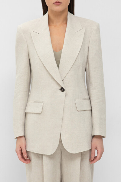 Льняной жакет BRUNELLO CUCINELLI с добавлением нитей ламе. Фасон изделия светло-бежевого оттенка предполагает прилегающий силуэт и наличие широких остроконечных лацканов. Однобортная модель застёгивается на крупную роговую пуговицу и отличается центральной шлицей сзади.