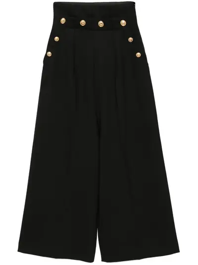 black front button fastening gold-tone buttons pressed crease two side slash pockets two rear flap pockets wide leg full-length