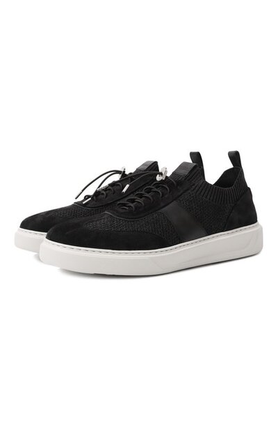 Трикотажные кеды на контрастной гибкой подошве укрепили накладками из кожи и замши. Модель со шнуровкой, регулируемой фиксатором, украсили брендированным патчем на манжете в рубчик.