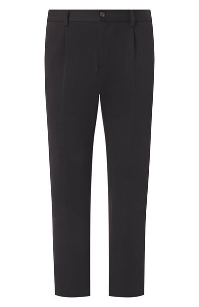 Брюки с защипами и стрелками станут основой повседневного образа любой сложности. Модель из кашемирового трикотажа дополнили четырьмя карманами, расположив над одним из задних брендированную пластину.
