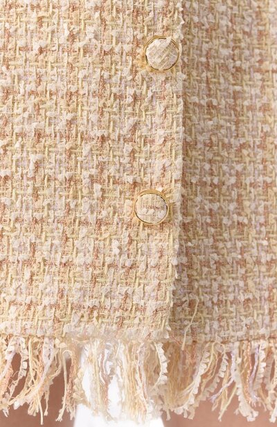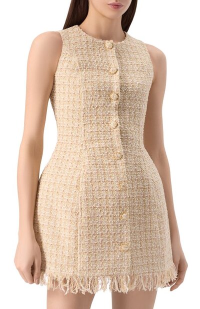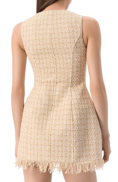 Приталенное мини-платье без рукавов, с круглым вырезом сшили из клетчатого твида на основе полиэстера. Модель с бахромой на подоле застегивается по всей длине спереди пуговицами, обтянутыми такой же тканью.