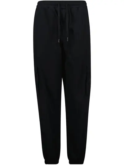black elasticated drawstring waistband two rear welt pockets two side flap pockets elasticated cuffs