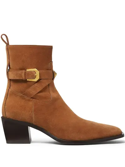 chestnut brown side zip fastening buckle-strap fastening 70mm block heel pull-tab at the heel
