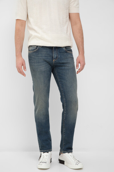 Джинсы Dolce&Gabbana из коллекции Essential с эффектом делаве. Коллекция «Essential» — это современный мужской гардероб, ряд вневременных культовых изделий, разработанный брендом. Для создания модели облегающего силуэта используется синий хлопковый деним. Добавление небольшого количества эластичных волокон в состав материала обеспечивает оптимальную посадку джинсов по фигуре. На маленьком кармане спереди присутствует чёрно-белый патч с логотипом, а правый задний карман декорирован кожаной нашивкой с серебристым лейблом и гравировкой Дома.