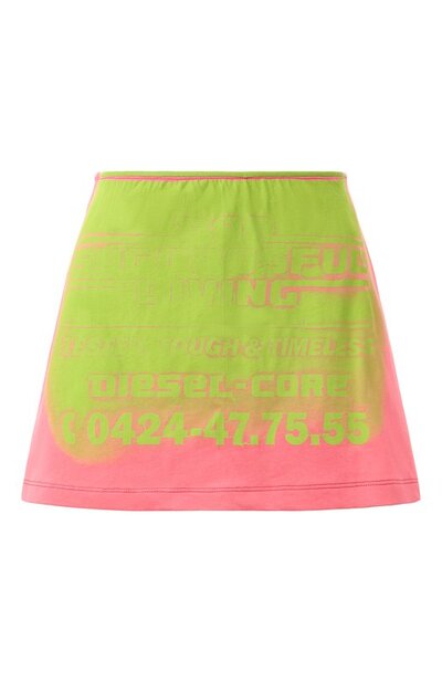 Мини-юбку выполнили из хлопка с брендированным принтом, который будто частично закрасили. Левый боковой шов дополнили фирменным алым ярлыком с логотипом марки.