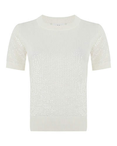 Джемпер с коротким рукавом выполнен из мягкого трикотажного хлопка с пайетками. Белый базовый цвет делает его универсальным для создания продуманного гардероба. Идеальная модель для стильных образов в любое время года.