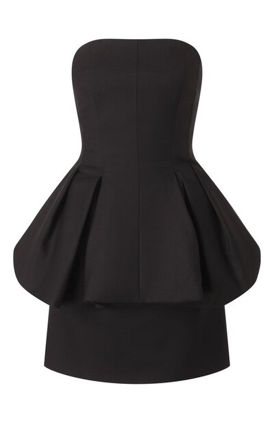 Для пошива короткого платья-бюстье с молнией на спинке использовали тонкий габардин из шерсти первого пострига. Широкая объемная баска спереди визуально моделирует силуэт.
