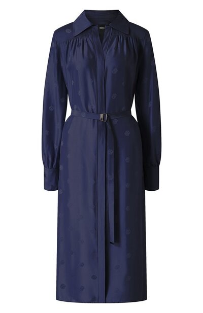 Платье-рубашку Dieshina1 с драпировкой вдоль кокетки, прямоугольными манжетами и супатной застежкой дополнили поясом с металлической пряжкой. Модель с V-образным вырезом сшили из микса из вискозы и шелка с фирменным паттерном.