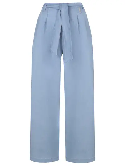 -Голубые брюки из легкого мягкого хлопка от PANICALE. -Модель свободного кроя с высокой посадкой, поясом со шлевками, прорезными и накладными карманами, застежкой на молнию и пуговицу. -За айдентику бренда отвечает декор шлевки цепочками Мониль.