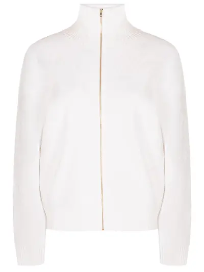 -Белый кардиган из вискозного трикотажа от AND THE BRAND. -Модель свободного силуэта со спущенной линией плеча, длинными рукавами, рельефными манжетами, поясом и высоким воротником, который можно носить как отложной, застежкой на молнию.