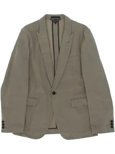 circa 2010s sage green front button fastening chest welt pocket two front flap pockets buttoned-cuff sleeves peak lapels central rear vent unlined Condition: GOOD. This previously owned and used item is in good condition with minimal signs of use. This may include fading of material or plating and scratches.