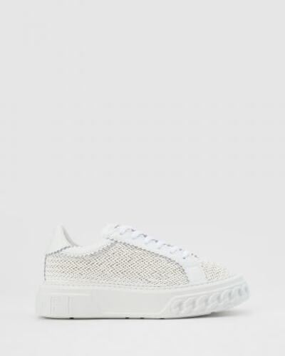 Кроссовки Casadei из искусственной кожи в белом цвете. Пара на высокой резиновой подошве, выполненная из переплетения тонких полос искусственной кожи. Стелька и подкладка выполнены из натуральной кожи. Подошва с фирменной цепочкой Casadei - из резины. Идеальный вариант для летних образов.