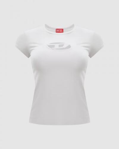Футболка белого цвета Diesel. Женская футболка из органического хлопка в сочетании с эластичным материалом для удобной облегающей посадки. Акцент дизайна - логотип D на груди, выполненный с помощью лазерной резки и вышивки. Круглая горловина, короткие рукава. Состав ткани: 93% хлопок, 7% эластан.