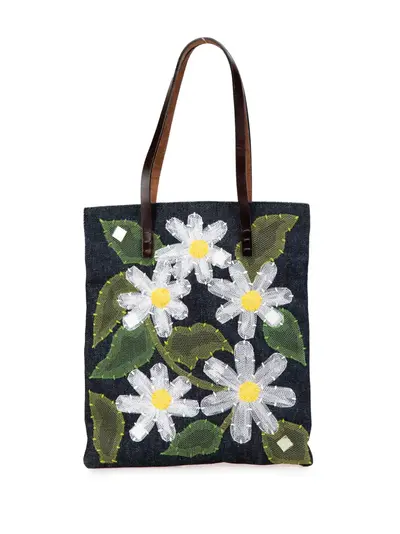 denim body with floral mesh appliques flat leather straps open top interior zip pocket blue Condition: GOOD. This previously owned and used item is in good condition with minimal signs of use. This may include fading of material or plating and scratches. Declared Damages: Handle/Strap Feature(s) Moderate Wear. Please refer to the photos on this product page for a detailed view of the item, including any damages declared.