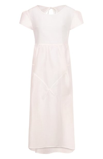 Платье с рукавами-фонариками и вырезом, открывающим спину, завязывается узкими лентами на горловине сзади. Асимметричная модель из шелково-льняной органзы гармонично впишется в летний гардероб.