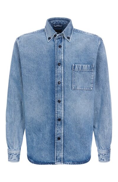 Рубашку с воротником button down, фигурным низом и бантовой складкой на спинке сшили из облегченного денима с добавлением лиоцелла. Выбеленную модель дополнили накладным нагрудным карманом.