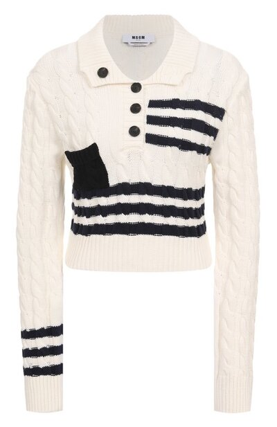 Поло с воротником, манжетами и широким поясом в рубчик связали из мягкой хлопковой пряжи. Модель с контрастным накладным карманом и арановыми узорами украсили полосатым мотивом спереди и брендированным патчем сзади.