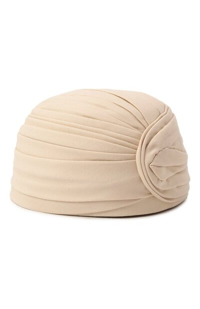 Чалму с жестким каркасом выполнили из текстурной шерсти. Материал задрапировали скульптурными складками, сформировав эффект запаха спереди. Сзади модель украсили фирменной эмблемой VLogo.