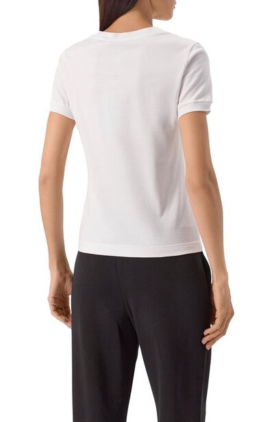 Футболку украсили небольшой накладкой-монограммой DG и контрастными аппликациями из цветочного кружева Cordonetto. Модель из рифленого хлопкового трикотажа вошла в коллекцию DNA.
