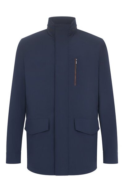 Куртку из полиэстера стрейч дополнили потайной кулиской на талии и капюшоном, скрытым в воротнике-стойке. Помимо боковых карманов с клапанами и нагрудного с замшевым кантом предусмотрели еще один внутренний с защитой от электромагнитных волн. Модель с регулируемыми манжетами застегивается молнией, спрятанной под штормовой планкой на кнопках.