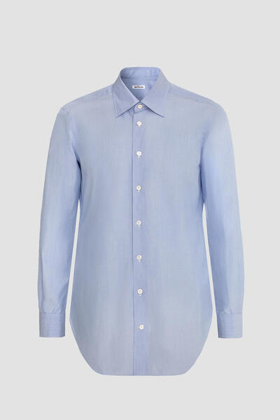 Классическая голубая рубашка Kiton — основа делового образа. Модель выполнена из премиального хлопкового трикотажа в мелкую бело-синюю полоску. Носите сорочку с темно-синим деловым костюмом Emiliano Zapata.