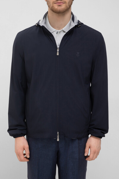 Двусторонняя куртка с глубоким капюшоном на кулиске от CORNELIANI. Одна сторона изделия выполнена из прочного тёмно-синего полиэфира с матовой текстурой, а для создания меланжевой стороны модели используются хлопок и полиэстер серого оттенка. Конструкция куртки предполагает застёжку на встречную молнию с двумя брендированными пуллерами и наличие двух прорезных карманов по бокам. Слева на груди вышита знаковая символика - эмблема, отсылающая к Дому.